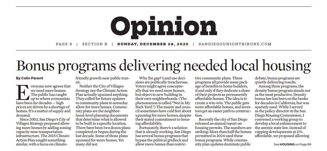 Opinion: Bonus programs delivering needed housing for San Diego, The San Diego Union Tribune, December 26, 2025