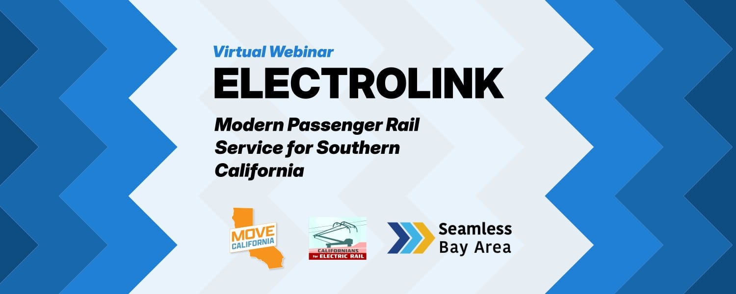 Join Californians for Electric Rail, Move California, and Seamless Bay Area for a webinar on how electrification, level boarding, and through-running for Metrolink, the Surfliner, and Coaster would transform Southern California transportation – and how we make it happen.