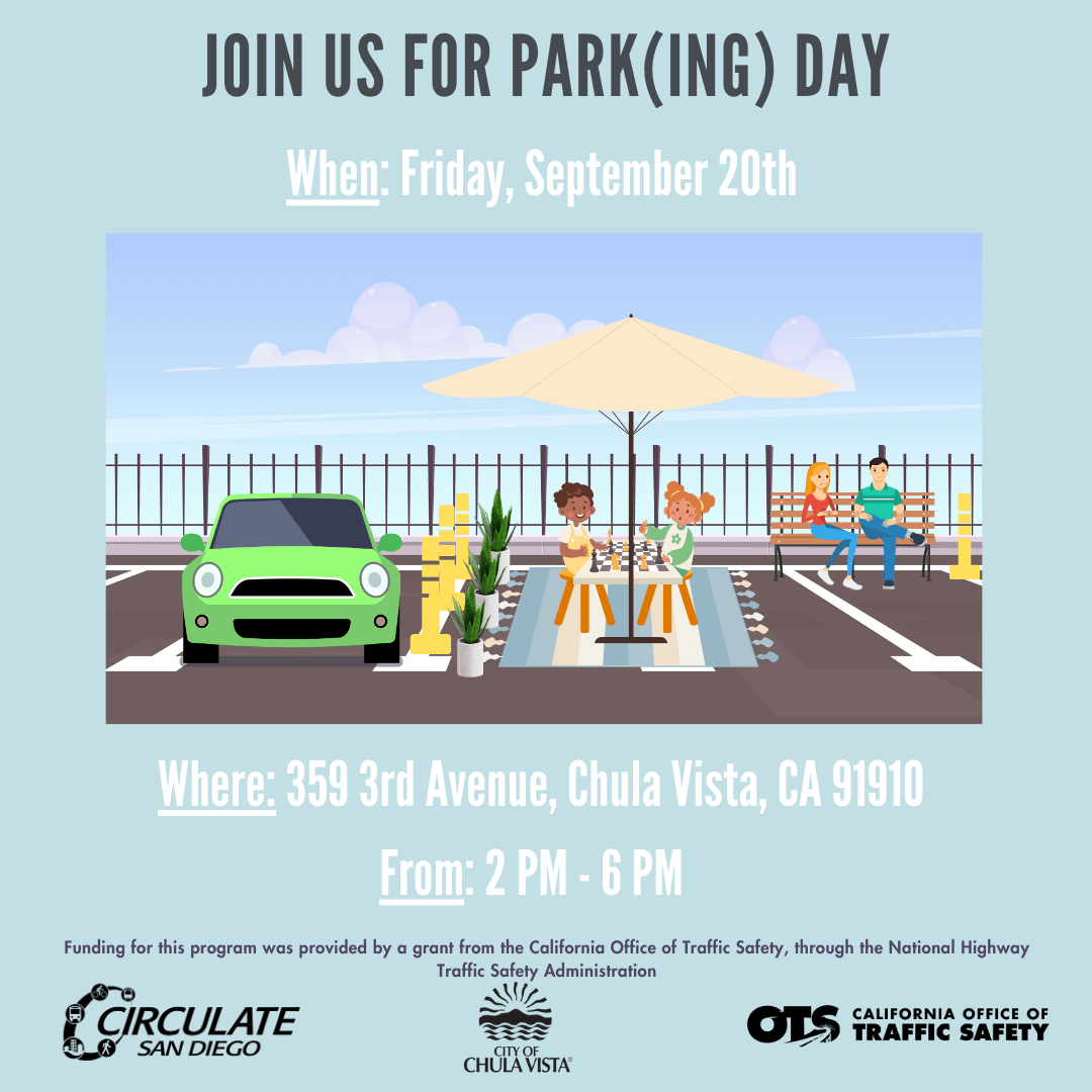 Today, Circulate San Diego will celebrate this year’s Park(ing) Day by installing a pop-up parklet at 359 3rd Avenue, Chula Vista, CA 91910.