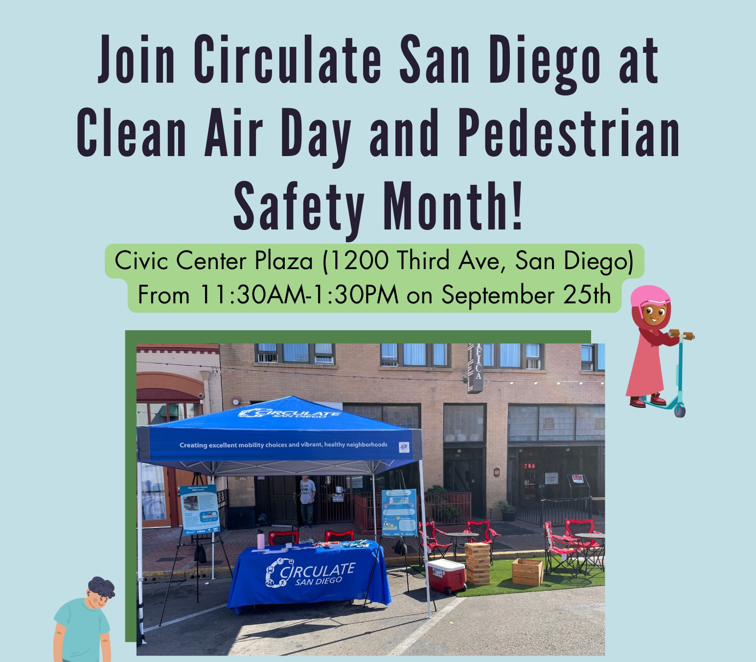 Join us September 25th at the Civic Center Plaza (1200 Third Ave, San Diego, CA 92101) to celebrateClean Air Day and Pedestrian Safety Month!