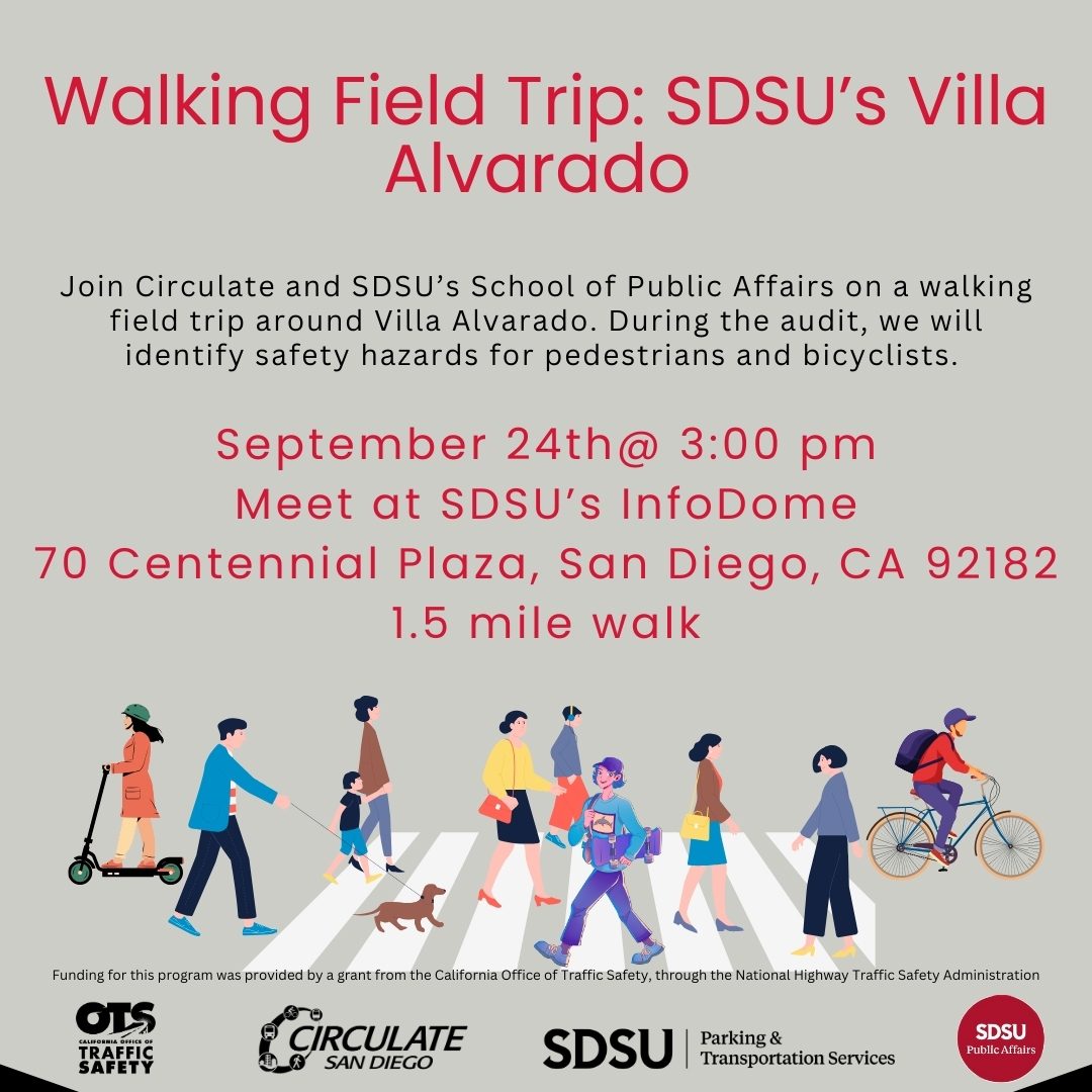 This 1.5-mile walk will focus on conflict areas for pedestrians, skateboarders, and bicyclists especially on the intersection of College Avenue and Alvarado Road. Participants will have the chance to observe this critical intersection firsthand and provide feedback on how to improve infrastructure and safety using a walk audit tool.